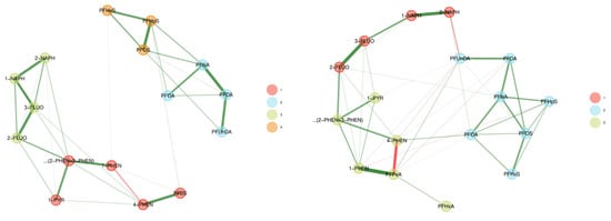 In the firefighters’ network, most PFASs and OH-PAHs clustered together in a community of the same chemical group. Two communities were created in the PFASs group (numbers 2 in blue and 4 in orange), and two in the OH-PAHs group (naphthalenes and fluorenes in community 3 in green, and other OH-PAHs in 1 in red). The exception was PFBS which was strongly linked to 4-PHEN, and therefore included in the community of OH-PAHs, rather than PFASs. In the control group network, three communities were detected: a community of naphthalenes and fluorenes (1, red), a community of seven PFAS (2, blue), and the rest of the compounds (other OH-PAHs, PFHxA, and PFPeA in the green community, 3).