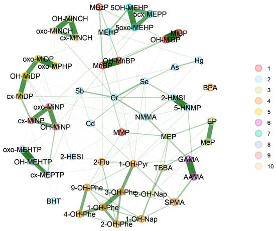 The weighted network for GerES V, allowing for assessment of the strength of the links between substances, is shown in Figure 10. Ten communities were identified. Links were stronger (i.e., thicker lines) within substance groups and among metabolites from the same parent compound; the strongest links were observed within acrylamide, aprotic solvents, parabens EP and MeP, DINCH, DEHTP, and several phthalates.