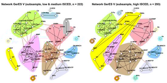 Stratification of the network for the GerES V subsample by education (ISCED), using creatinine-standardised and creatinine-adjusted data. Data were corrected for sex, smoking status, age, and BMI. Low ISCED reflects educational levels 0–4 from the ISCED (International Standard Classification of Education) and high ISCED reflects educational level ≥5. Black lines indicate dependency between nodes (biomarkers) within a community; red lines indicate dependency between nodes in different communities.