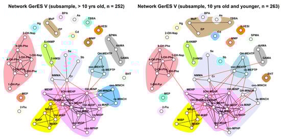 Stratification of the network for the GerES V subsample by median age (10 years old), using creatinine-standardised and creatinine-adjusted data. Data were corrected for sex, smoking status, ISCED, and BMI. Black lines indicate dependency between nodes (biomarkers) within a community; red lines indicate dependency between nodes in different communities.