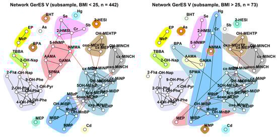 In Figure 5, another interesting community is the one consisting of 1-PYR and MiBP, MnBP, and TTMA. The most important route of exposure for 1-PYR is through smoking; however, living in a highly polluted environment also has an influence on the 1-PYR levels []. No common route of exposure for 1-PYR and MiBP has been found in the literature. It is intriguing to notice that the link is no longer found in the network for participants with a high level of education, but it is conserved in those with a low educational level, as seen in Figure 6. Furthermore, we also noticed that the link is no longer conserved in participants with a BMI > 25 kg/m2 while it is in participants with a BMI ≤ 25 kg/m2 (Figure 7). Figure 7 also shows more dependencies in the low BMI category, where all substances are part of a community, with some communities comprising multiple chemical families. Additionally, some dependencies across communities can be observed. Moreover, we observe again a community of BPA and MEP. In contrast, the high BMI category displays smaller communities and many substances not part of a community.