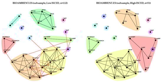Stratification of the network for the BIOAMBIENT.ES dataset by education (ISCED level). Low ISCED (left panel) is defined by participants belonging to educational levels 0–4 according to the ISCED (International Standard Classification of Education) and high ISCED (right panel) is defined by participants belonging to educational level ≥5. Data were corrected for sex, age, BMI and smoking status. Black lines indicate dependency between nodes (biomarkers) within a community; red lines indicate dependency between nodes in different communities.