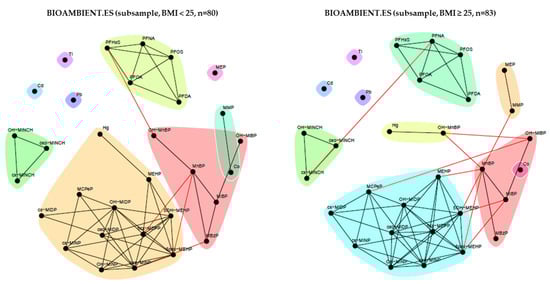 Stratification of the network for the BIOAMBIENT.ES subsample by BMI. Unweighted network for participants with a normal weight (defined as BMI < 25) is shown in the left panel, while the network for participants with overweight (BMI ≥ 25) is shown in the right panel. Data were corrected for sex, age and smoking status. Black lines indicate dependency between nodes (biomarkers) within a community; red lines indicate dependency between nodes in different communities.