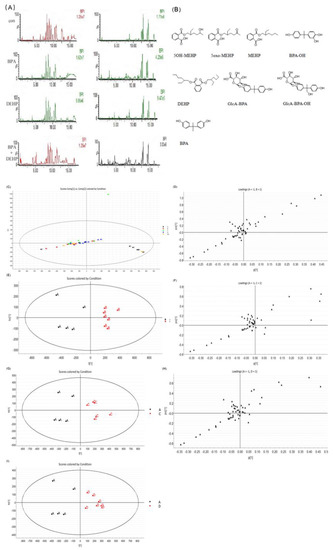 BPI chromatogram of blood samples from each group in positive (left) and negative (right) ion modes (A). Chemical structure of BPA, DEHP and its metabolites (B). The plasma principal component analysis score of the mother between the control group and the exposed group. Vector, loading map (C–I). Data are presented as mean ± SEM. [Note]: A: corn oil group, B: BPA group, C: DEHP group, D: BPA+DEHP group. Each represents a marker.