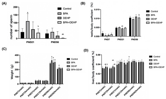 In the BPA+DEHP group, there was a significant decrease in sperm counts in comparison with the control group on PND56 (Figure 2A, p < 0.05). On PND21, a significant decrease in the number of sperm compared to the control group was observed in the BPA group (Figure 2A, p < 0.05). In the BPA+DEHP group, there was a significant decrease of the tesis/body coefficient compared to the BPA group on PND56 (p < 0.05). The tesis/body coefficient was also decreased significantly in the DEHP group compared to the control group on PND21 (Figure 2B p < 0.05). The body weight was significantly increased in the BPA and DEHP groups on PND56 in males (p < 0.05), while there was no significant change only in the BPA group on PND21. Moreover, there was a significant decrease in the DEHP group compared to the BPA group on PND56 in females, indicating a sex-specific difference (Figure 2C, p < 0.05). The liver/body coefficient of DEHP and BPA+DEHP groups was obviously higher compared to the control group, so as the BPA+DEHP group compared to the BPA group on PND7 in males and females (Figure 2C, p < 0.05). A significant increase in the liver/body coefficient was observed in the BPA+DEHP group compared to the BPA group of females on PND7 (p < 0.05), whereas no obvious change was observed in all groups on PND21 (Figure 2D, p < 0.05).