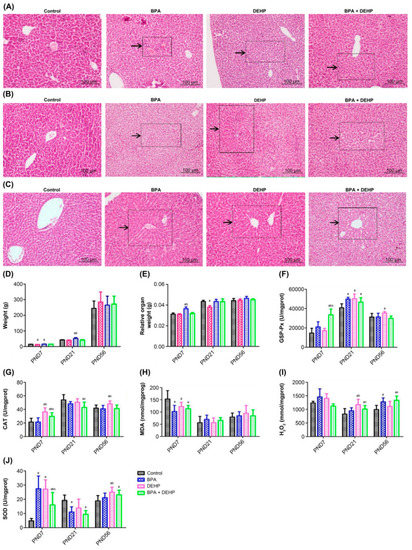 Changes of body weight and organ coefficient in offspring indicating that gestational and lactational exposure to BPA and DEHP could interfere with the normal growth and development of offspring. Pathological findings demonstrated that BPA, DEHP, and their co-exposure during pregnancy could lead to fatty vacuolar degeneration and hepatocyte hypertrophy or necrosis-induced hepatic dysfunction in offspring. We then focused on the underlying mechanisms. NAFLD can be caused by oxidative stress [35] due to an imbalance level between the generation of reactive oxygen species (ROS) and the antioxidant system, including damage to lipids, proteins or DNA in tissues and cells. In the present study, antioxidant enzymes (SOD), glutathione peroxidase (GSH-PX), catalase (CAT), and oxidation products (hydrogen peroxide (H2O2) and MDA (lipid peroxidation products)) were detected on PND7, 21 and 56. In principle, combined exposure to BPA and DEHP during pregnancy can cause hepatic oxidative stress in offspring according to analysis in other reports [37,38,39,40], and the effects of the combined exposure are different from exposure to the two agents alone, while the interaction mechanism caused by the mixed exposure should be further evaluated. Moreover, these effects on the offspring are likely indirectly driven by direct effects on the pregnant females, rather than direct effects on the offspring. This is also an aspect that warrants further research.