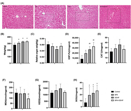 Histopathological changes of pregnant females with haematoxylin and eosin (A). Body weight gain of pregnant females exposed to BPA, DEHP and BPA+DEHP (B). Relative organ weight of pregnant females exposed to BPA, DEHP and BPA+DEHP (C). GSH-PX activity changes of pregnant females exposed to BPA, DEHP and BPA+DEHP (D). CAT activity changes of pregnant females exposed to BPA, DEHP and BPA+DEHP (E). H2O2 assay of pregnant females exposed to BPA, DEHP and BPA+DEHP (F). MDA assay of pregnant females exposed to BPA, DEHP and BPA+DEHP (G). Superoxide dismutase activity of pregnant females exposed to BPA, DEHP and BPA+DEHP (H). Data are presented as means ± SEM. [Note]: “a”: compared with control, “b”: compared with BPA group, p < 0.05, n = 6. Scale bar = 1000 μm.