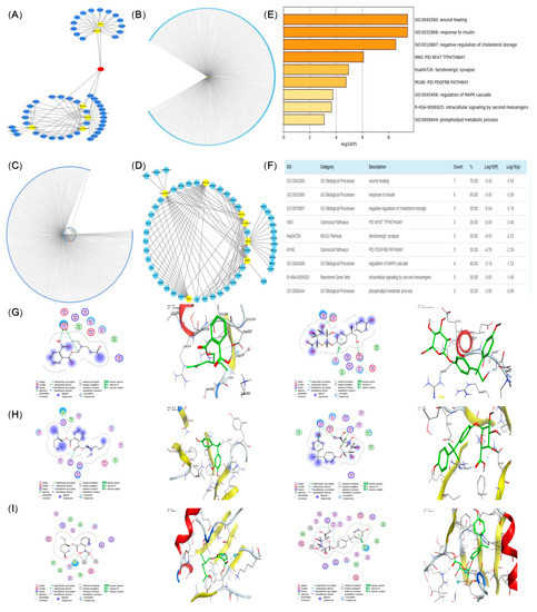 A total of 473 nodes were involved in the disease-targeted network, made up of one disease node and 472 gene target nodes. Networks construction was carried out by the merged function of the network visualization software Cytoscape (ver.3.6.0) as follows: (1) Venn diagram of metabolite-targeted network and disease-targeted network (Figure 5C). There were 11 targets in which the evaluated compounds played a role, and the interaction network diagram of metabolites and targets was constructed by taking the targets in the intersection part (Figure 5D). Five biological processes and one KEGG signaling pathway were involved (Figure 5E,F, p < 0.05) [21].