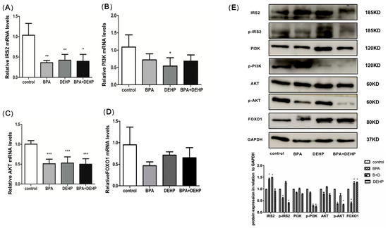To determine the effects of BPA, DEHP, and their combination as well as the biological pathways they affect, the mRNA levels of proteins with high computer docking scores were examined. Compared with the control, the mRNA levels of insulin receptor substrate 2(IRS-2) and AKT were significantly decreased in all groups (Figure 6A, C, p < 0.05). The PI3K mRNA expression level was significantly lower in the DHEP group than in the control group (Figure 6B, p < 0.05). In contrast, FOXO1 mRNA levels were not affected significantly by BPA, DEHP, and their combination (Figure 6D). Western blotting was used to assess the abundance of proteins involved in the PI3K/AKT signaling pathway. The protein levels of p-AKT and p-PI3 were reduced significantly by exposure to BPA, DEHP, and their combination (Figure 6E, p < 0.05). The protein level of FOXO1 increased significantly after exposure to DEHP and BPA+ DEHP (Figure 6E, p < 0.05).