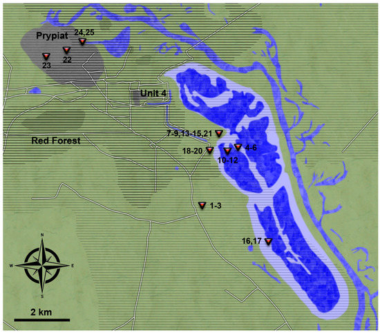 Map of the sampling area. Red pins indicate the sample collection points. In the cooling pond bright blue coloration indicates areas that have recently become dry and dark blue areas were still submerged in 2018. Hatches indicate deposition of 200–2000 kBq 90Sr/m2, more pronounced, darker hatches 2000–20,000 kBq 90Sr/m2 and multiple hatches >20,000 kBq 90Sr/m2. Redrawn after [1,16].