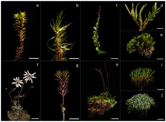 Figure of some of the sampled mosses; # indicates the sampling location, described in detail in Figure 1. (a) Tortula calcicolens (#24), (b) Dicranum polysetum (#19), (c) Plagiomnium cuspidatum (#9), (d) Homalothecium philippeanum (#8), (e) Orthotrichum speciosum (#21), (f) Marchantia polymorpha (#16), (g) Polytrichum piliferum (#4), (h) Bryum cf. badium (#6), (i) Bryum × intermedium (#17), (j) Bryum argenteum (#13). Scale bar = 5 mm.