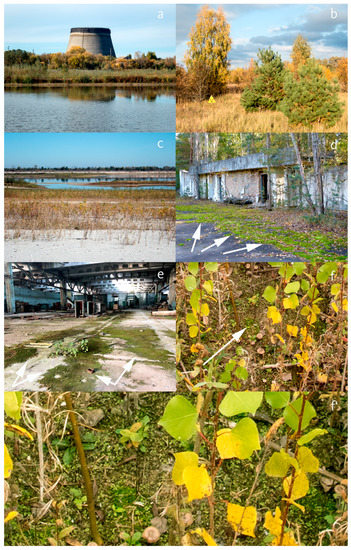 Selected sample sites. (a) Cooling pond with unfinished cooling tower, (b) dry meadow (#1–3), (c) bank of the cooling pond (#16,17), (d) Prypiat, moss cushions (#24), (e) decaying factory building in Prypiat with Amblystegium serpens covering concrete floor (#23), (f) Bryum moss cushion (#10–12), (f’) detail of Bryum. Mosses indicated by white arrows.