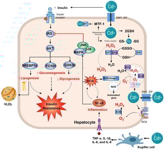 Oxidative stress and inflammation disrupt the insulin metabolic pathway in the liver. Inflammation per se can induce insulin resistance via the MAPK pathway. Low-level Cd exposure indirectly stimulates MAPK in mice and cell cultures through oxidative stress [,,]. Mechanisms include MT depletion and GSH reduction [,], ROS overproduction through NADPH oxidase activity [,], and complex III mitochondrial by accumulating unstable semiubiquinones. Increased superoxide radicals [,] and free iron, zinc, and selenium replacement with lost enzymatic activity (e.g., CAT, SOD, and GPx) have also been found [,]. Notably, oxidative stress, TNF-α, and IL-1β activate the c-Jun NH2-terminal kinase (JNK), generating insulin signaling interruption by modifying the phosphorylation of insulin receptor and insulin receptor substrate-1, provoking insulin resistance [,,]. Changes in mitogen signaling consequently alter the metabolic pathway. This redundancy causes loss of glucose homeostasis and a high lipogenic rate observed in Cd-exposed animal models.