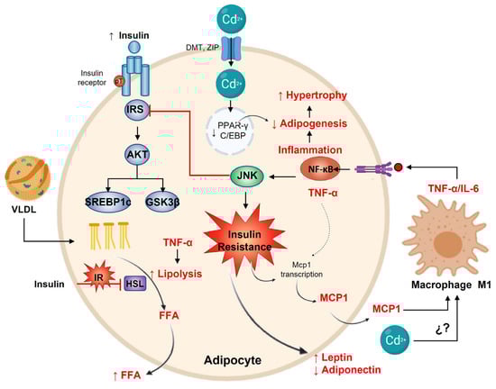 Adipocyte hypertrophy inevitably reaches a limit at which additional anabolic pressure is excessive due to cell expansion limitations. Adipocytes reach this threshold and initiate an inflammatory response []. Pro-inflammatory cytokines, such as TNF-α, inhibit adipocyte differentiation, increase lipolysis, interfere with insulin signaling, and induce a macrophage-like phenotype in preadipocytes [,]. TNF-α also induces increased IL-1β and IL-6, which polarizes adipose tissue macrophages, increasing subclass M1 recruitment that releases and produces more TNF-α, IL-6, IL-12, IL-23, and IL-1β. Meanwhile, M2 macrophages diminish, as well as IL-10, IL-4, and TGF-β cytokine levels [,]. Several findings showed that Cd activates the NF-κB pathway in adipocytes, leading to the upregulation of pro-inflammatory cytokines [,]. Studies have also demonstrated reliable data identifying chronic low-grade inflammation as an essential link between systemic insulin resistance and metabolic diseases. These effects include the activation of NF-κB and inhibition of AMPK signaling, leading to impaired insulin homeostasis []. Serum concentrations of several pro-inflammatory cytokines inhibit insulin signaling, which results in signal redundancy since insulin resistance induces inflammation and vice versa []. In addition, Cd exposure and inflammation negatively affect adipokine secretion. Subcutaneous Cd administrations have shown adipokine diminishing dose dependently [,]. However, chronic environmental exposure conditions increase leptin release, even associated with insulin concentration, while serum adiponectin concentration did not show changes []. Adiponectin plays an anti-inflammatory role and has insulin-sensitizing effects [,]. Moreover, adiponectin is a biomarker of healthy adipocyte expansion and prevents steatosis risk []. Meanwhile, leptin regulates food intake, lipid metabolism, energy expenditure, and glucose homeostasis []. Leptin releasing is proportional to adipocyte size; adipocyte hypertrophy carries hyperleptinemia, whereas lipodystrophy observes hypoleptinemia. The disturbance of insulin, adiponectin, and leptin contribute to metabolic diseases []. However, how or what Cd does in adipocytes impairment adipokine production and release have not been fully understood.
