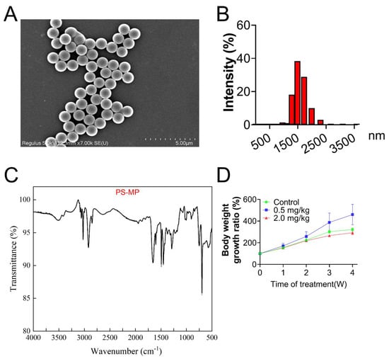 Characterization of PS-MPs by SEM, DLS, and FTIR. (A) PS-MP morphology (scale bar = 5 μm). (B) Hydrodynamic size distribution of PS-MPs. (C) FTIR image of PS-MP. (D) Body weight growth ratio.