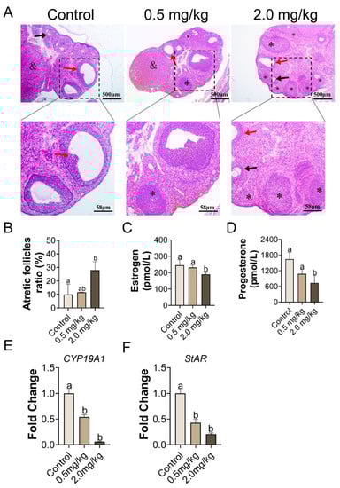 Histopathological alterations, serum hormone concentration, and gene expression relevant to hormonogenesis in response to PS-MPs. (A) The representative images of H&E stained ovary (black arrow: primary follicles, red arrow: cystic follicles, asterisk: atretic follicles, and: corpus luteum), n = 5 per group. (B) Atretic follicles ratio, n = 5 per group. (C,D) ELISA was used to assess the amount of estradiol and progesterone in serum. (E,F) qPCR detection the comparative mRNA expression of CYP19A1 and StAR as in ovary of rats, standardized to GAPDH, n = 3 per group. The information was presented as the mean ± SD. Different letters indicate significance.
