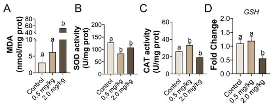 The MDA levels were higher in the 2.0 mg/kg PS-MPs treatment group than in the control group (p < 0.05, Figure 3A). Compared with the control group, the antioxidant catalytic abilities of SOD and CAT were drastically reduced in the 2.0 mg/kg PS-MPs group (p < 0.05, Figure 3B,C). However, the results in the 0.5 mg/kg PS-MPs group were equivocal and contradictory on the activity of SOD and CAT (Figure 3B,C). The expression level of the antioxidative gene glutathione (GSH) decreased substantially in the 2.0 mg/kg group, as per RT-qPCR testing of the ovarian tissues (Figure 3D).