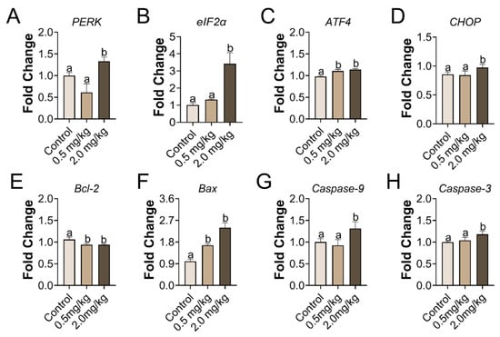 The mRNA expression of genes involved in ER stress and apoptosis in the ovary upon PS-MPs stimulation. (A–D) Relative expression levels of genes associated with ER stress, including PERK, eIF2α, ATF4, and CHOP. (E–H) Relative expression levels of genes associated with apoptosis, including Bcl-2, Bax, Caspase-9, and Caspase-3. The information was presented as the mean ± SD. Different letters indicate significance. n = 3 per group.