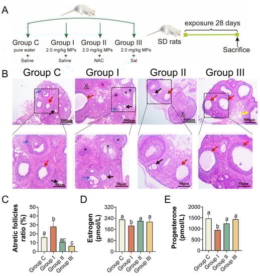 After one week of acclimatization, thirty-two female rats were split into four categories: the control (Group C), 2.0 mg/kg PS-MPs (Group I), 2.0 mg/kg PS-MPs with NAC (Group II), and 2.0 mg/kg PS-MPs with Sal (Group III) treatment groups (n = 8). The rats in Group C were treated with deionized water, and the rats in the other three groups were administered 2.0 mg/kg through oral gavage. Once every two days, Groups II and III received 100 mg/kg NAC and 1.5 mg/kg Sal by intraperitoneal injection, respectively []. Half an hour following the end of the gavage operation, the intraperitoneal injection procedure was carried out. NAC and Sal exposure times were 14 days due to the 28-day length of the overall experimental period. Beyotime Biotechnology Co., Ltd. (Shanghai, China) and Macklin Reagents, Ltd. (Shanghai, China) provided the NAC and Sal, respectively. The rats in Groups C and I were intraperitoneally injected with the same volume of sterile saline. The weights of the rats were measured daily for 28 days. All rats were sacrificed by cervical dislocation at PND 59, which already have full sexual maturity. The procedures of blood sample collection and sample storage were the same as described above.