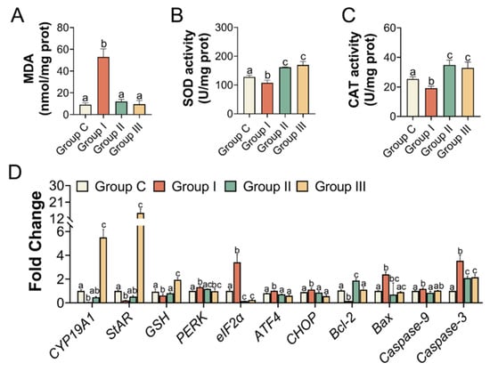 Oxidative stress indicators and relative expression of genes in the ovary. (A) The concentration of MDA, the antioxidant activity of SOD, and CAT (B,C), n = 5 per group. (D) The relative mRNA levels of oxidative stress, ER stress, apoptosis, and hormones in the ovary, n = 3 per group. Different letters indicate significance.