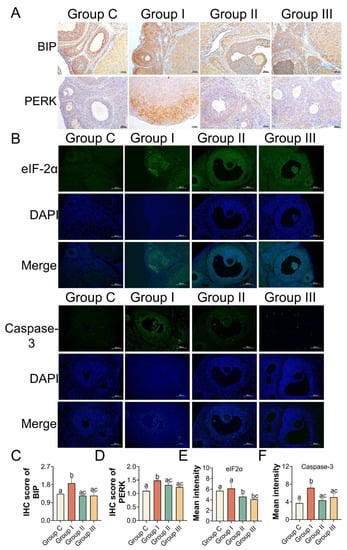 Protein activity of BIP, PERK, eIF2α, and Caspase-3 in ovaries after NAC and Sal treatment. (A) IHC images of BIP and PERK (scale bar = 100 μm). (B) eIF2α and Caspase-3. Blue: DAPI, green: eIF2α, and Caspase-3 (scale bar =100 μm). (C,D) IHC scores of BIP and PERK. (E,F) Mean intensity results. Different letters indicate significance. n = 3 per group.