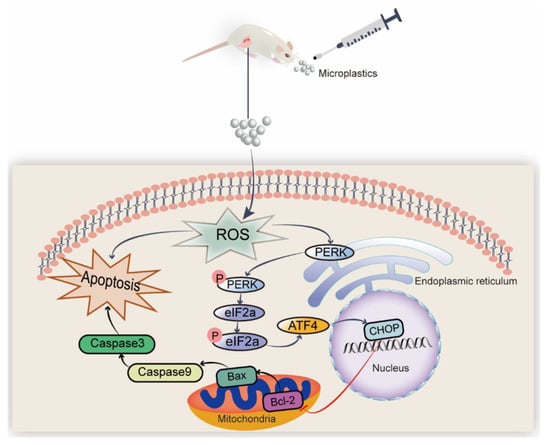 Children’s special behaviors, such as crawling, hand–mouth activity, playing with toys, and touching personal products, increase their exposure to MPs []. Researchers recently found that the exposure of infants and children to MPs is indeed greater than that of adults []. The effects on reproduction are one of the main concerns when considering the effects of MPs on children’s health []. Children’s reproductive systems are immature; thus, juvenile reproductive toxicity can eventually lead to infertility []. A previous study demonstrated that MPs exposure (five weeks) in a hypothetical scenario may pose an irreversible endocrine disturbance with particular indicators of reproductive toxicity in mammals []. The ovaries’ hormone secretion contributes to maintaining pubertal development and growth. Mice exposed to MPs developed inflammation of the ovaries and experienced reduced-quality oocytes []. MPs trigger reproductive damage in mice by the peroxidation and amplification of the P38 MAPK signal transduction []. These investigations prove that MPs can cause oxidative stress, which ultimately leads to reproductive damage []. It is postulated that oxidative stress is one of the key processes causing female infertility []. Of note, Haddadi et al. recently published that 5 μm MPs exposure by oral gavage was detected in the duodenum and ovary in rats, leading to defective ovarian function via oxidative stress []. The abnormal production of free radicals (ROS) might contribute to the buildup of unfolded or misfolded peptides in the endoplasmic reticulum lumen []. However, if the system is overwhelmed with the accumulation of misfolded proteins, the unfolded protein response (UPR) is provoked to trigger ER stress. Chronic ER stress mediates apoptotic signaling. Under pathological conditions, the protein kinase R-like ER kinase (PERK) signaling pathway was activated and dissociated from the ER chaperone immunoglobulin protein (BIP) which is the initiator of ER stress, exacerbating cellular apoptosis []. PERK is activated and directly phosphorylates the eukaryotic initiation factor (eIF2α), which in turn activates the transcription factor the C/EBP homologous protein (CHOP) mainly through the activated transcription factor 4 (ATF4) []. Extensive studies have demonstrated that ER stress exerts a pivotal role in the development of the ovary and involves multiple ovarian diseases []. Nevertheless, the mechanism related to ER stress-activated by MPs is rarely articulated. The Female Pubertal Assay serves as an in vivo screening assay to help identify chemicals or mixtures that have the potential to interact with the endocrine system, by identifying effects on pubertal development and thyroid function in the intact juvenile/peripubertal female rat. This assay is capable of detecting anti-thyroid, estrogenic, or anti-estrogenic chemicals, or agents which alter pubertal development []. Consequently, the following contents will elucidate the ovarian apoptosis in detail induced by MPs exposure through the oxidative and ER stresses in juvenile rats.
