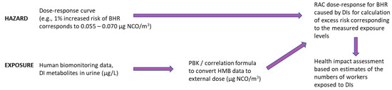Schematic presentation of health impact assessment (HIA) using human biomonitoring (HMB) data to convert urine diisocyanate (DI) metabolite concentration to external isocyanate (NCO) exposure using a physiological based kinetic (PBK) model and a correlation formula. The dose–response curve for DI-caused bronchial hypersensitiveness (BHR) was used in HIA and provided by RAC [5].