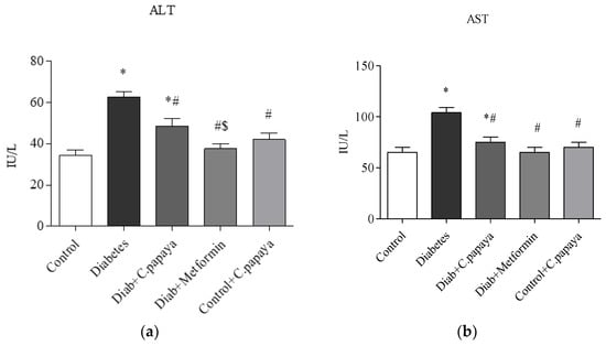 (a,b) Effect of C. papaya on (a) ALT and (b) AST levels. p < 0.05 was considered statistically significant among the groups: *-control; #-diabetes; $-C. papaya-treated T2DM.