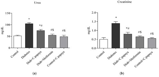 (a,b) Role of C. papaya on (a) urea and (b) creatinine levels. p < 0.05 was considered statistically significant among the groups: *-control; #-diabetes; $-C. papaya-treated T2DM.