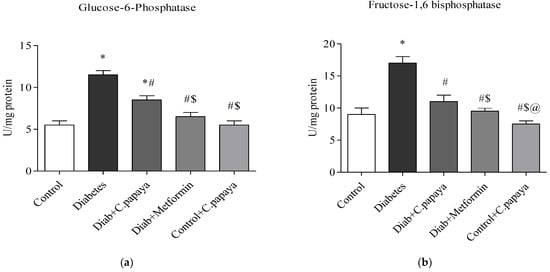 (a,b) Role of C. papaya on (a) G6P and (b) FBPase levels. p < 0.05 was considered statistically significant among the groups: *-control; #-diabetes; $-C. papaya-treated T2DM; @-T2DM rats + Metformin-treated T2DM.