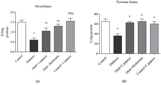 (a,b) Efficacy of C. papaya on (a) HK and (b) PK levels. p < 0.05 was considered statistically significant among the groups: *-control; #-diabetes; $-C. papaya-treated T2DM; @-T2DM rats + Metformin-treated T2DM.