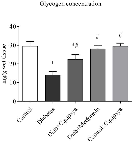 Role of C. papaya on hepatic glycogen concentration level. p < 0.05 was considered statistically significant among the groups: *-control; #-diabetes.