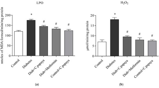 Role of C. papaya on (a) LPO and (b) H2O2 levels. p < 0.05 was considered statistically significant among the groups: *-control; #-diabetes.