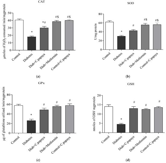 (a–d) Role of C. papaya on enzymatic antioxidants levels. p < 0.05 was considered statistically significant among the groups: *-control; #-diabetes; $-C. papaya-treated T2DM.