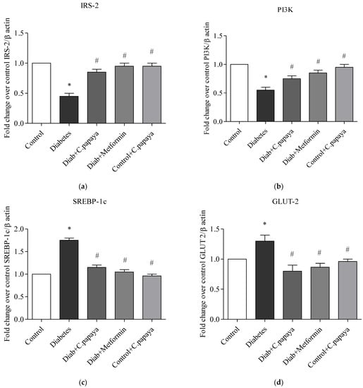 (a–d) Role of C. papaya on (a) IRS-2, (b) PI3K, (c) SREBP-1c, and (d) GLUT-2 mRNA expression levels. p < 0.05 was considered statistically significant among the groups: *-control; #-diabetes.