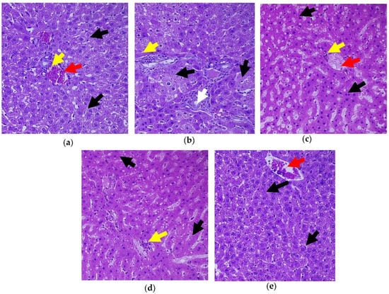Histopathology of hepatic tissue displaying the effect of C. papaya. (a) Control rats; (b) T2DM rats presented degenerated hepatocytes (black arrow) while matched with the control; (c) C. papaya-treated T2DM rats manifested improved hepatocytes with hepatic bands; (d) metformin-treated T2DM rats exhibited the restored structure of hepatocytes; (e) C. papaya-treated control rats. Yellow arrow—centrilobular inflammation; white arrow—bile duct; red arrow—blood vessels.