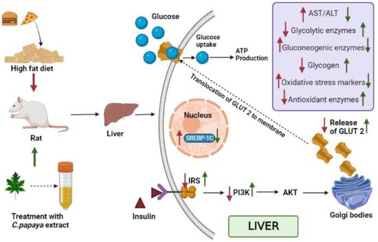 In order to surpass the adverse effects of conventional diabetic treatments, seeking natural remedies is a definitive target. Our research focuses on finding therapeutic and preventive approaches that could slow the processes that lead to T2DM and enhance the treatment of issues related to diabetes. Thus, we intended to identify a natural plant-based product as a therapeutic approach to the effective management of diabetes mellitus. Several pieces of scientific literature have recorded the antidiabetic, immunomodulatory, and hepatoprotective outcomes of Carica papaya (C. papaya) [,,,]. In our previous work, we displayed the molecular action of the antihyperglycemic property of C. papaya in the skeletal muscle of T2DM animal models that reinstated glucose homeostasis via in vivo and in silico analysis. Our current study concentrates on the molecular mechanism of C. papaya in mitigating insulin resistance in the liver.