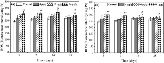 Effects of Rac- (a) and S-metolachlor (b) on ROS levels in E. fetida. * p < 0.05 and ** p < 0.01 indicate the statistical significance between the control group and treatment group at the same exposure time. “Δ” represents a significant difference between Rac- and S-metolachlor treatment groups at the same exposure concentration (p < 0.05).