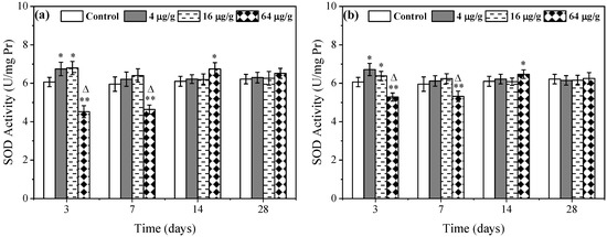 Effects of Rac- (a) and S-metolachlor (b) on SOD activity in E. fetida. * p < 0.05 and ** p < 0.01 indicate the statistical significance between the control group and treatment group at the same exposure time. “Δ” represents a significant difference between Rac- and S-metolachlor treatment groups at the same exposure concentration (p < 0.05).