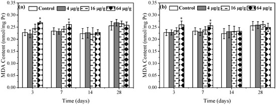 Effects of Rac- (a) and S-metolachlor (b) on MDA content in E. fetida. * p < 0.05 indicates the statistical significance between the control group and treatment group at the same exposure time.