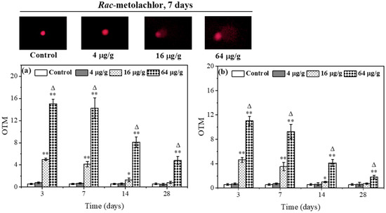 Effects of Rac- (a) and S-metolachlor (b) on DNA damage in E. fetida. * p < 0.05 and ** p < 0.01 indicate the statistical significance between the control group and treatment group at the same exposure time. “Δ” represents a significant difference between Rac- and S-metolachlor treatment groups at the same exposure concentration (p < 0.05).