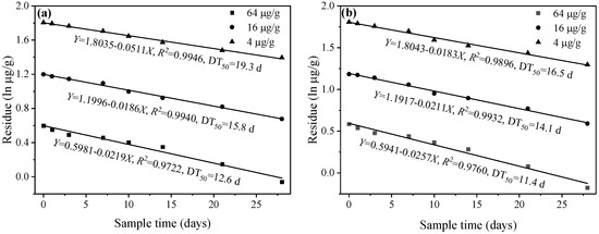 In this study, the residual data were well fitted by the first-order kinetic equation (R2 > 0.97) and the result was shown in Figure 5. The calculated degradation half-lives (DT50) of 4, 16, and 64 μg/g Rac-metolachlor were 12.6, 15.8, and 19.3 d in the soil, respectively. As for S-metolachlor, its degradation half-lives were 11.4, 14.1, and 16.5 d at a concentration of 4, 16, and 64 μg/g, respectively. At the same treated concentration, the degradation half-live of S-metolachlor is generally shorter than that of Rac-metolachlor.