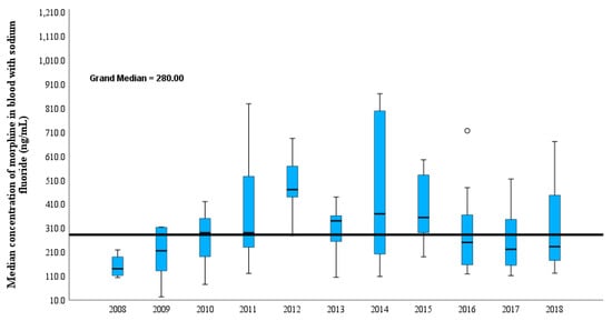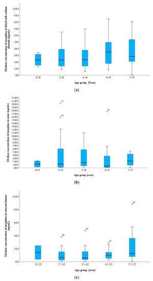 - Fugelstad, A.; Ahlner, J.; Brandt, L.; Ceder, G.; Eksborg, S.; Rajs, J.; Beck, O. Use of Morphine and 6-Monoacetylmorphine in Blood for the Evaluation of Possible Risk Factors for Sudden Death in 192 Heroin Users. Addiction 2003, 98, 463–470. [Google Scholar] [CrossRef] [PubMed]