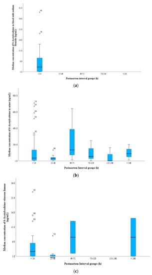 - Skopp, G. Postmortem Toxicology. Forensic Sci. Med. Pathol. 2010, 6, 314–325. [Google Scholar] [CrossRef]