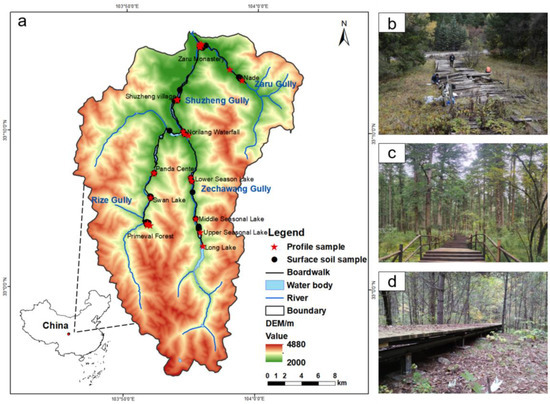 Jiuzhaigou National Natural Reserve, situated in northern Sichuan Province, Southwest China, mainly consists of highland travertine lakes, travertine waterfalls, and other typical karst landscapes, covering an area of 643 km2 (Figure 1). The altitude of the tourist area is 2000–3100 m above sea level. The scenic route is shaped like a “Y” and is approximately 30 km long. The mean annual temperature and precipitation are 7.3 °C and 622 mm, respectively. Most of the yearly rainfall is concentrated from May to September, ~150 days. The soil texture is mainly sandy loam [46]. Due to various geological disasters, e.g., landslides and debris flows, vegetation and soils in the area were damaged to varying degrees, resulting in rockfall accumulation or exposure of limestone bedrock.