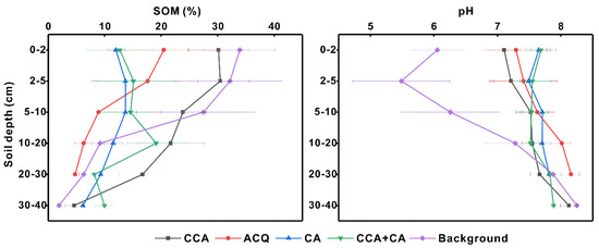 Averaged SOM and pH values within soil profiles under different preservative–treated boardwalks.