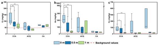 Lateral distribution of Cr (a), As (b), and Cu (c) concentrations in surface soils at a depth of 0–10 cm under CCA-, ACQ-, and CA-treated wooden walkways. *, ** indicate significant (p < 0.05) and highly significant (p < 0.01) differences.