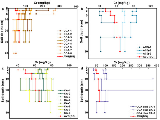 Vertical distribution of Cr concentration in soil samples under wooden walkway with four treatments: (a) CCA treatment; (b) ACQ treatment; (c) CA treatment; (d) CCA plus CA treatment.