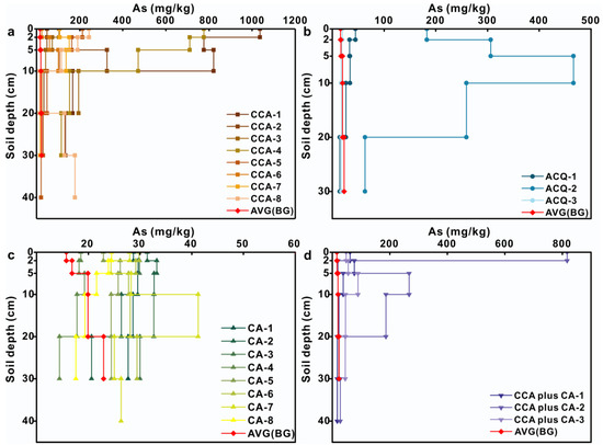 It is obvious that the As content was mainly enriched at a depth of 0–10 cm in the soils under CCA-treated boards compared to that in the background profile and gradually decreased to the background value with increasing soil depth (Figure 5). Detailed information was provided in the Supplementary Materials (Table S4). The average As content at depths of 0–2 cm, 2–5 cm, 5–10 cm, 10–20 cm, and 20–30 cm reached 20, 16, 13, 4, and 4 times as high as that in the background content at the corresponding depths, respectively. The mean As contents in the soils under the ACQ- and CA-treated boardwalks were close to the background value and did not change significantly with increasing soil depth, except for the ACQ-2 profile. The As content in the CCA plus CA-treatment profiles decreased with increasing soil depth, except for CCA plus CA-2. Compared with the soil risk screening values, the As contents in the profiles of the ACQ- and CA-treatments were close to each other except for the ACQ-2 profile, which was less hazardous to the environment. The As contents in the CCA-treatment and the CCA plus CA-treatment far exceeded the soil risk screening values, and therefore posed a high environmental risk.