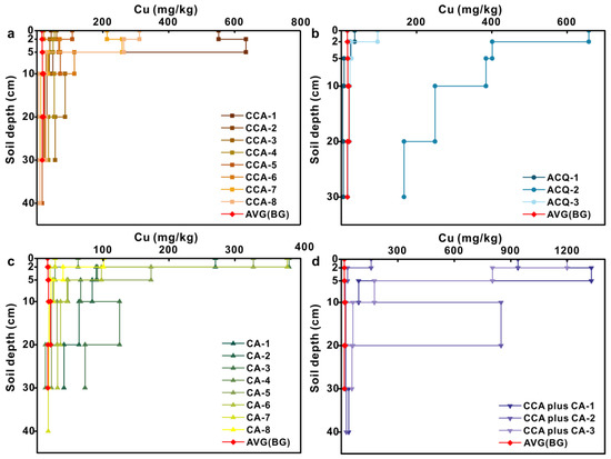 Vertical distribution of Cu concentration in soil samples under wooden walkway with four treatments: (a) CCA treatment; (b) ACQ treatment; (c) CA treatment; (d) CCA plus CA treatment.